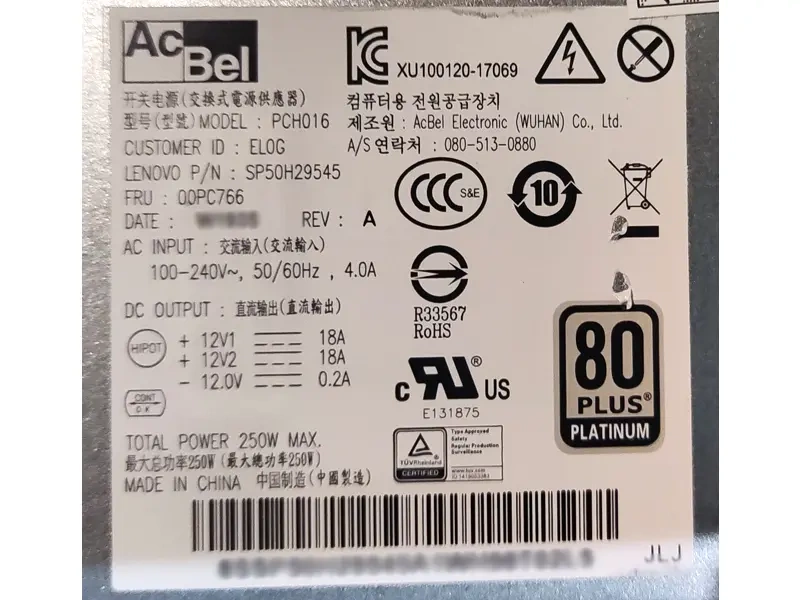 Zasilacz Lenovo AcBel PCH016 250W (np. 00PC766) Lenovo P330 G2 TOWER[350191]